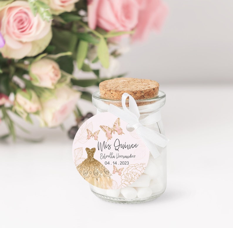 Pink and Gold Butterfly Sticker, Butterfly Quinceanera Party Favors, Pink Quinceanera Stickers, Butterfly Labels,Pink Tag, 2in Circle